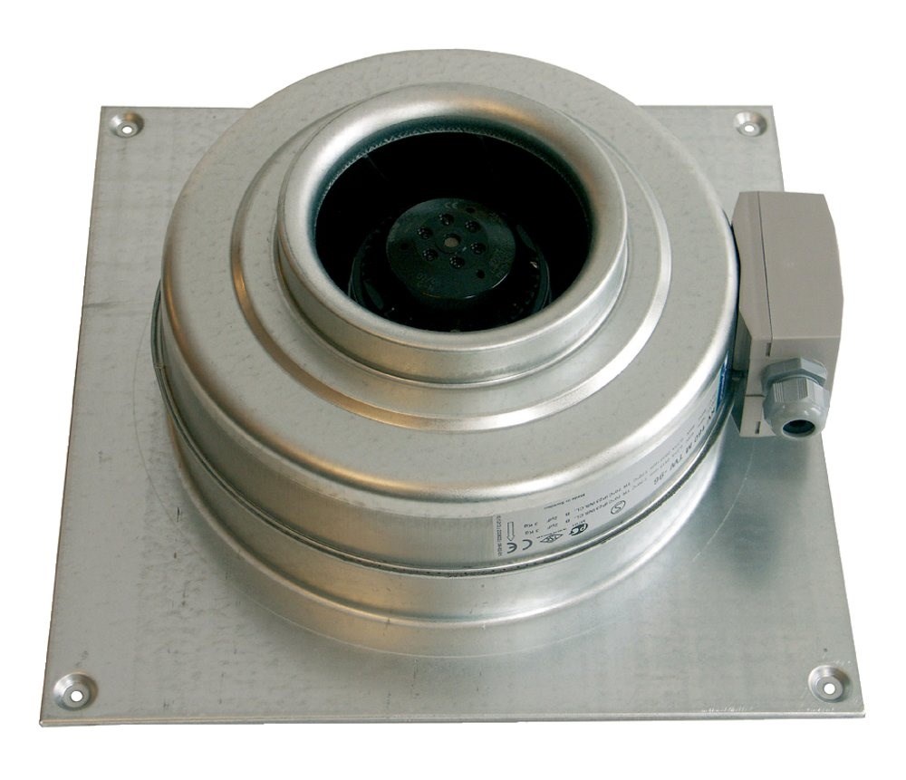 Вентилятор имеет крыльчатку с загнутыми назад лопатками и двигатель с внешним ротором.