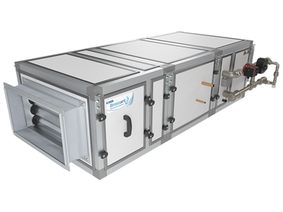 Приточная установка с фреоновым охладителем, водяным нагревателем и смесительным узлом с 2-х или 3-х ходовым клапаном (узел подбирается исходя из типа водоснабжения), комплектуется воздушным клапаном с электроприводом (с возвратной пружиной), системой цифровой автоматики JetLogic с цветным сенсорным пультом управления и всеми необходимыми датчиками. Автоматика может управлять различными типами ККБ.